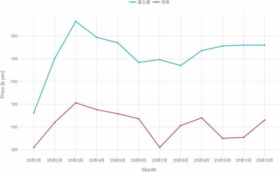 25年11月のノートPCの平均単価では、市場全体が12万7700円であるのに対して、FCCLの平均単価は14万8000円と、2万300円も高く、最新データとなる25年12月のノートPCの平均単価でも、市場全体が13万1000円であるのに対して、FCCLの平均単価は14万2800円と、1万1300円高い。25年の1年間で、最も平均単価が高いPCメーカーとなっている。