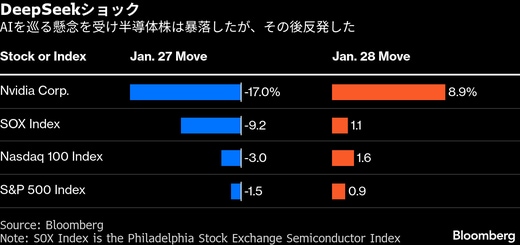 中国の新興企業DeepSeek(ディープシーク)が1月26日に発表した、強力で低コストとされるAIモデルにより、最近の米国テックブームの基盤を脅かすとの懸念が一気に広がった。ベンチャーキャピタリストのマーク・アンドリーセン氏は、これを「AIのスプートニク・モーメント」と呼んだ。翌27日、米国市場が開くとエヌビディア株は17%急落し、史上最大の時価約6000億ドル(93兆5900億円)が消し飛んだ。半導体株は2020年3月以来の最悪の日となった。