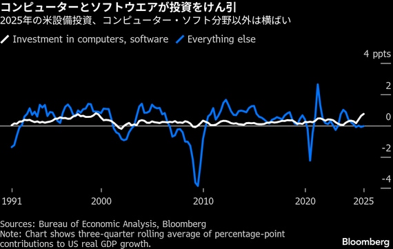 ただし、この投資拡大のほとんどは、コンピューター機器やソフトウエアへの支出増によって支えられている。今後についてエコノミストは、トランプ氏が打ち出したワン・ビッグ・ビューティフル・ビル法や、AI分野への継続的な投資が、2026年の設備投資を押し上げると予想している。