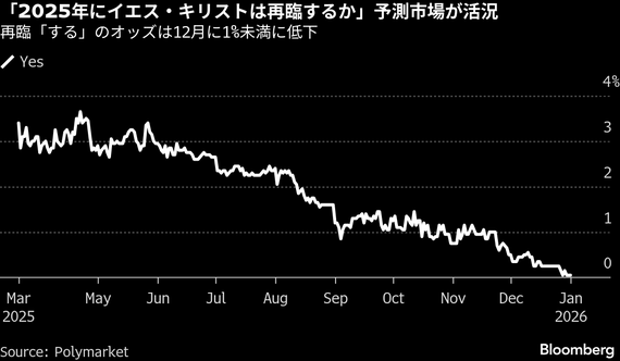 現在、賭けの対象は26年末までにキリストが再臨するかどうかに移っている。ポリマーケット参加者は現時点で確率を2%と見積もっており、「する」に賭けて的中した場合のリターンは5700%超に達する。