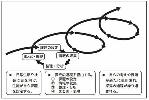 結果として現行の学習指導要領に掲載されている「探究における生徒の学習の姿」の図が「正しい探究」として認識され、「何が探究なのか?」と問われることもなければ、探究の歴史的な系譜や、海外実践との比較分析なども十分になされないまま探究サイクルの穴埋め問題のような実践が量産されている。