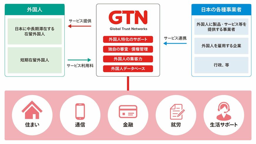 日本に来た外国人がまず困るのが住居だ。外国人であることを理由に入居を断られるケースは多いが、GTNは家賃保証や賃貸仲介のサービスを提供し、住まいをサポート。 社宅向けにGTN自身が物件を借り上げてサブリースで提供するサービスも展開している。