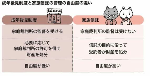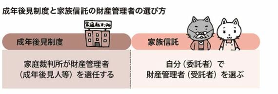 一方、家族信託は、本人(委託者)と財産管理者(受託者)との契約によって設定されるので、第三者に財産管理者を決められるといったことはありません。ただし、成年後見制度でも「任意後見」というものを使えば将来の財産管理者をあらかじめ決めておくことができますので、「財産管理者を自分自身で決められる」というメリットは家族信託独自のものではありません。