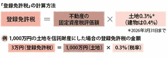 信託登記には「登録免許税」という税金がかかります。なお、登録免許税は不動産の固定資産税評価額に一定の税率「土地は0.3%(2026年3月31日まで)、建物は0.4%」を掛けた金額になります。