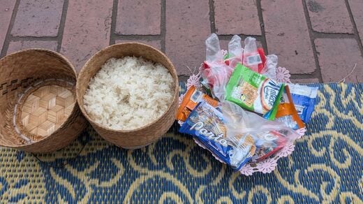 地元の信者は家でもち米を焚いて持参するが、観光客には“托鉢セット”が販売される。価格を聞いたら英語ができる女性がやってきて「10万キープ(約720円)」と両手を広げた。