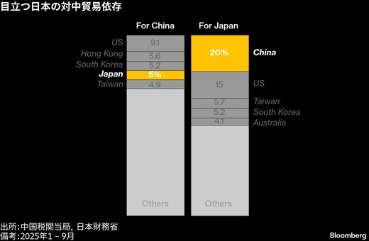 中国ははるかに大きな経済的影響力を持つが、日本にも選択肢がないわけではない。ブルームバーグ・エコノミクスによれば、日本は中国にとって第2位の輸出先であり、全体の約4%を占める。世界的な貿易摩擦が中国の製造業を圧迫する中、日本は重要な販路となっている。