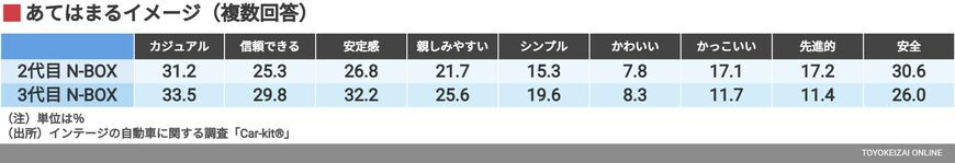では、3代目、2代目を購入した人たちは、N-BOXに対してどのようなイメージを抱いているのだろうか。次に示すのは、3代目N-BOXを購入した人は3代目N-BOXについて、2代目を購入した人は2代目についてのイメージをそれぞれ回答した結果である。