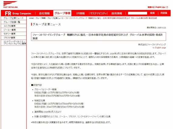 アパレル業界では、ユニクロなどを運営するファーストリテイリングが初任給を25年春に33万円へ引き上げた。さらに、26年春からはグローバルリーダー候補については、現行の33万円から約12%増の37万円(初任給・月額)にアップ。年収の目安は約590万円(現行526万円)となる。