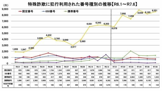 ◎2025年6月時点で、特殊詐欺1万1365件中、8551件で国際電話が利用されていた