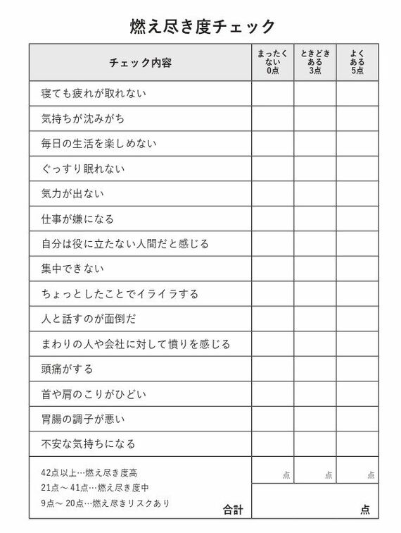 あなたは大丈夫でしょうか? チェックリストで、ご自身の「燃え尽き度」を確認してみてください。