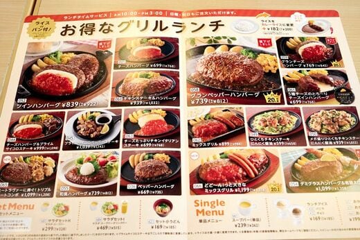 さて、メニューを見ていきたい。テーブルに広げられていたのは「お得なグリルランチ」。鉄板焼きのハンバーグの写真が並んでおり、ライスをカレーライスに変更することもできる。ヘルシーとは対極的にあるメニュー構成であり、写真を見ていると理性より先に胃袋が反応し始めるのがわかる。頭の片隅で「今日はいいか」「好きなものを食べればいいじゃないか」という悪魔のささやきが聞こえ始めた……。
