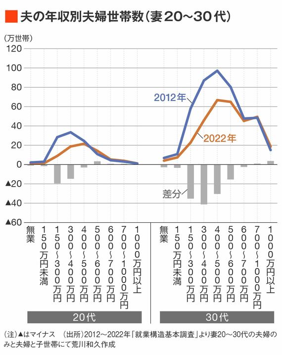 以下のグラフは、就業構造基本調査に基づき、妻が20代と30代の場合の夫の個人年収別に夫婦世帯(子無+子有)の数を2012年と2022年の10年間の変化を示したものです。