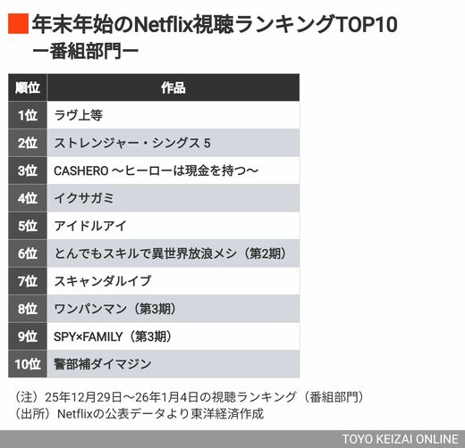 2位には、元旦にシリーズ最終章のラストを飾るエピソードが配信された『ストレンジャー・シングス』が入りました。約10年にわたって続いてきたNetflixの代表作が、年末年始のランキングでもその強さを見せた結果と言えるでしょう。