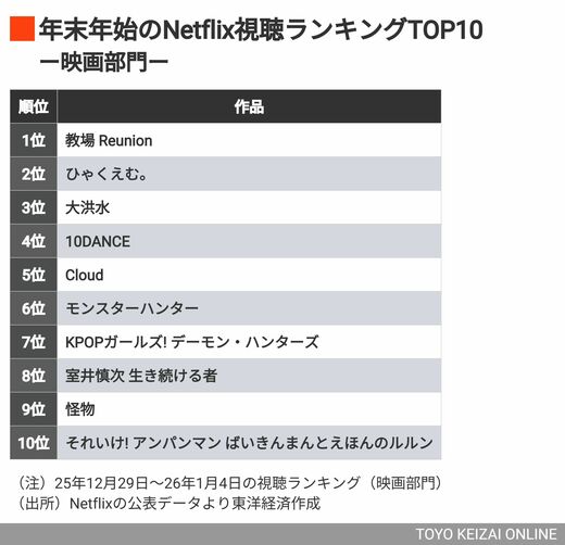 その中で、7位に入ったアニメ映画『KPOPガールズ! デーモン・ハンターズ』は、独占配信作品かつNetflixの史上最多視聴作品です。日本では28週にわたってランキング入りを続け、劇場映画が並ぶ中で、Netflix純正タイトルが割って入った形となりました。