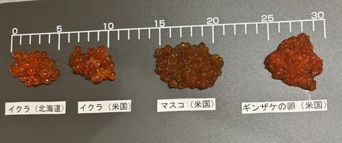 イクラ(シロサケの卵:北海道産とアメリカ産)、マスコ(カラフトマスの卵・アメリカ産)、ギンザケの卵(アメリカ産)を比較したのがこの写真です。