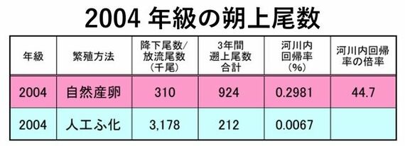 上の表は2004年と20年ほど前のデータですが、自然産卵を重視するアメリカ同様の視点での分析結果です。河川回帰率は、自然産卵魚が人工孵化魚の約45倍になっています。ここでわかることは、自然産卵を減らして人工孵化による稚魚放流を増やすという行為は、強いサケを減らし、回帰率が低い弱いサケの比率を増やしてしまうことに他ならないということです。