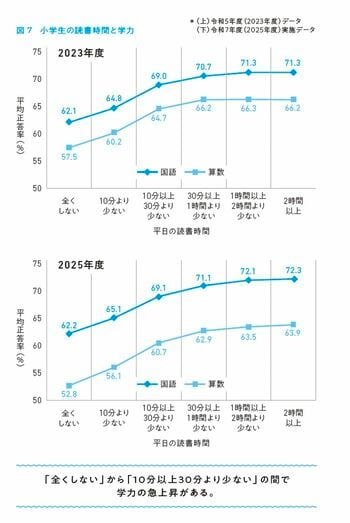 次の図は、小学6年生版です。全国学力テストにおける平日の読書時間と学力の関係を示しています。