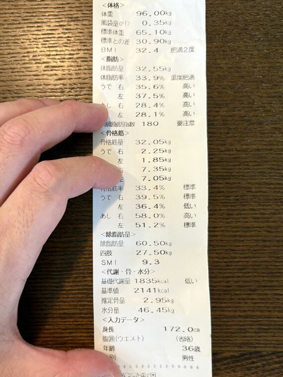 FIT365には筋肉量と体脂肪量を測定できるボディプランナーが設置してある。入会したタイミングで測ってみると以下の数値が出力された。