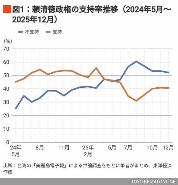 今後の台湾情勢を見通すにあたり、まず頼清徳政権の支持率を振り返りながら25年の台湾内政を回顧したい。台湾のネットメディア「美麗島電子報」の世論調査(図1)によると、頼総統の支持率は、24年5月の政権スタートから1年近くは50%前後、不支持は40%前後で推移していた。総統選挙での頼清徳の得票率が40%であったことからすると、この支持率は悪くない。