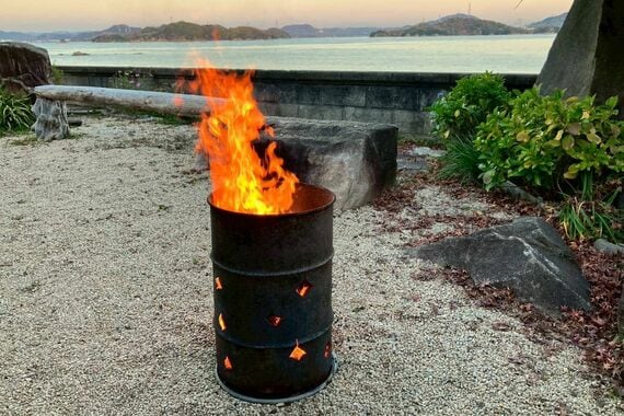 ゼンさんの住宅兼店舗は、道路を挟んですぐ目の前に海がある古民家です。日が傾きかけた頃にミカン、私、友人Mの3人で伺うと、ゼンさんは庭にあるドラム缶で盛大にたき火をしていました。