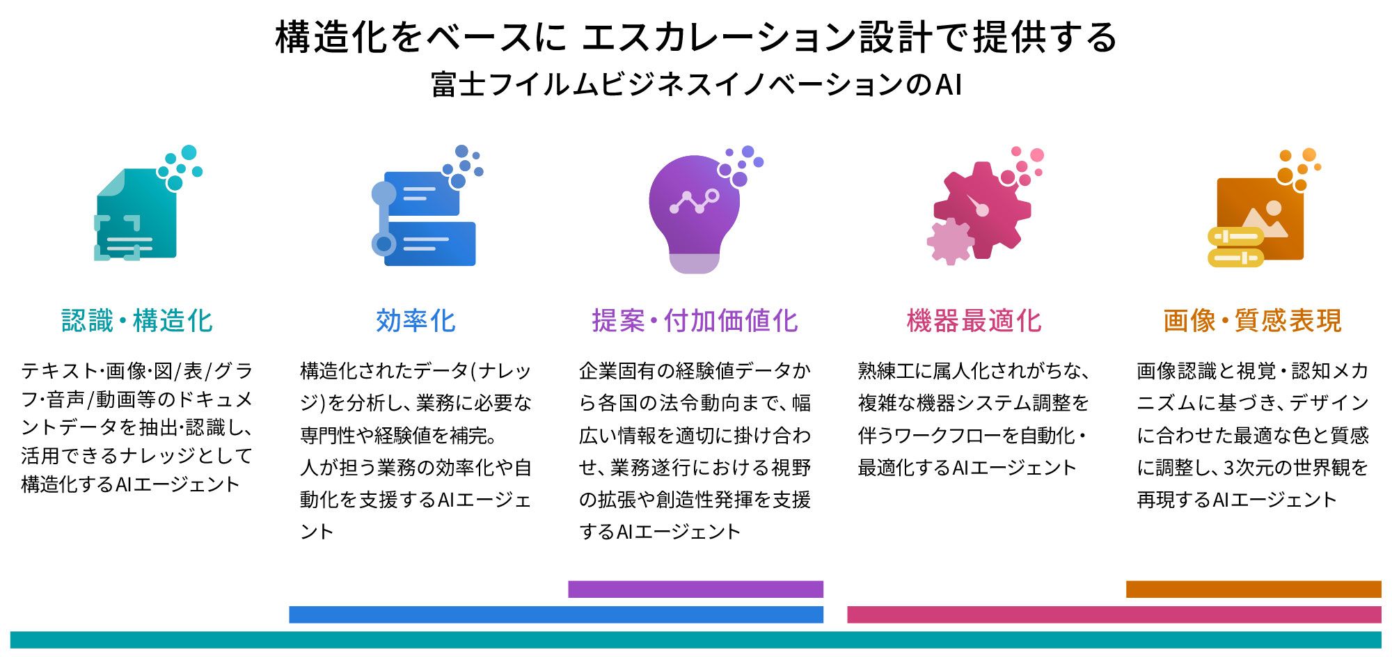 富士フイルムビジネスイノベーションが展開するAIの提供価値は、以下の5つのカテゴリーで構成されている。