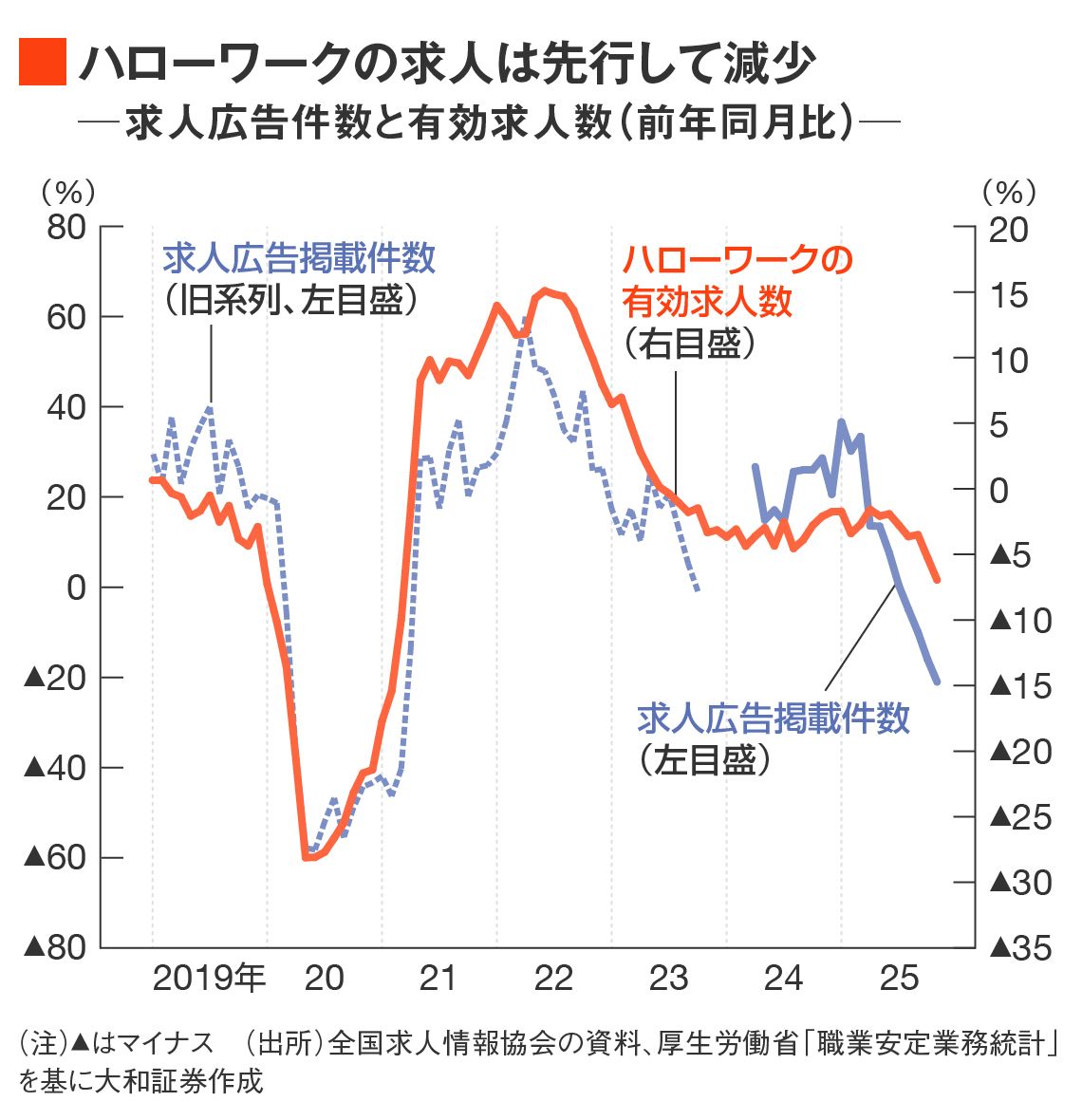 この点について、ハローワークを経由した入職数は減少傾向にあり(24年は13.2%にとどまっていた)、当該のデータを軽視する向きも多かったが、やはり労働市場の軟化は進んでいたようだ。