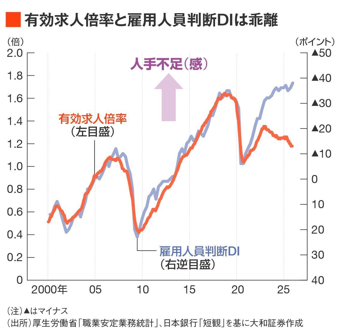 求人数が減少している今、DIが示す「人手不足感」は、体感ベースの不足であって、経済的な「労働需要の不足」とは一致しないこともありうる。