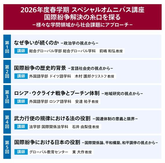 とりわけ「スペシャルオムニバス講座」は、全学部がワンキャンパスに集う上智大学の強みを最大限に生かした設計となっている。「国際紛争解決」や「AIとの共存」といった複雑なテーマに対し、歴史・技術・経済など異なる分野の専門家がさまざまな角度から光を当てることで、立体的な視座を提供する。