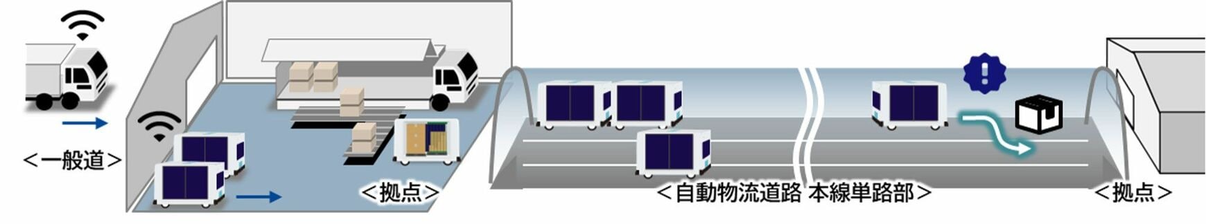 自動物流道路での輸送イメージ。規格化された荷姿の荷物を拠点までドライバーがトラックで運び、拠点間を自動で輸送。拠点での荷下ろしや積み込みも自動で行う