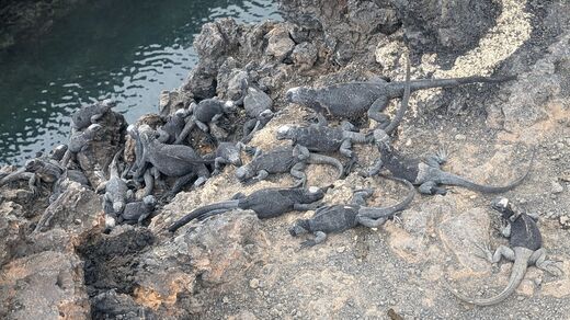 「溶岩でできたティントレーラス島はガラパゴスペンギンやイグアナが繁殖する場所」というガイドの説明を聞きながらふと足元を見ると、ウミイグアナがびっしりいる。ちょっとキモイ。