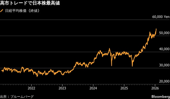 14日の為替市場で円は1ドル=159円45銭と18カ月ぶりの安値を付け、株式市場では日経平均株価が最高値を更新した。30年物国債利回りは13日に過去最高水準に並んだ。