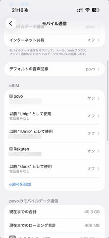 また、2回線目をデータ通信の“足し”にすることも可能だ。例えば、2回線目として基本料が無料のpovoをeSIMとして入れておき、1回線目のデータ容量が足りなくなったときだけトッピングを買ってデータ通信を切り替えるといった使い方ができる。大手キャリアの場合、追加のデータ容量が1GBあたり1000円前後と高いため、容量超過時の速度制限を回避する手として有効だ。