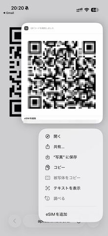 Safariの場合、設定用のQRコードを長押しするとメニューが表示されるが、その中に「eSIMを追加」という項目がある。ここをタップすると、QRコードをカメラで読み込んだ時と同じようにダウンロードが開始する。メールでも同様に、QRコードを長押しすることで「eSIMを追加」というメニューが表示される。