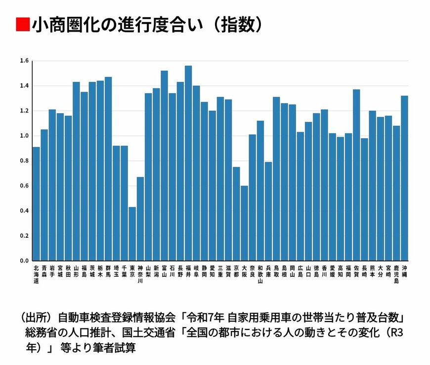 結果を見ると、クルマ社会化が進み、かつ高齢化が進行した地域ほど移動総量の変化が大きい。この試算で機動力が急速に落ちた=小商圏化が進行したのは、福井県、富山県など北陸・甲信越地域。次いで北関東、南東北地域という結果になった。