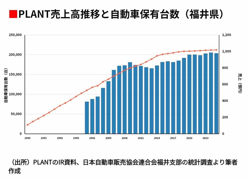 PLANTはもともとホームセンターだったが、食品売場を充実させ、生活必需品が何でもそろう超大型店を開発。地方の生活需要をすべて取り込むことを目指して大成功し、2009年には売上高900億円弱まで急成長した。ただ、それ以降は伸び悩み、直近期でも売上高977億円と1000億円の手前で足踏みが続いている。広域商圏を必要とする大型店というビジネスモデルだけに、地域の機動力が頭打ちになると成長が難しくなることがわかる。