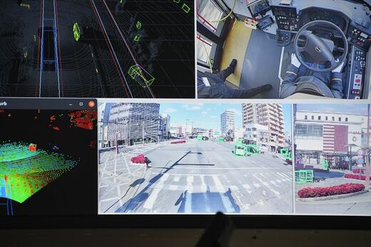バスに乗り込むと運転席の後ろにモニター類が設置されていた。ここにLiDARやカメラが検知した映像や情報が映し出される。また、GNSSによって数cmレベルの誤差で自己位置を推定し、3次元地図の上に映し出される。