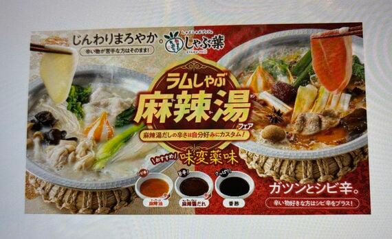 しゃぶしゃぶチェーンの「しゃぶ葉」は、花椒を利かせた麻辣湯だしを食べ放題メニューとして導入し、鍋として楽しめる設計とした。辛いもの好きの新たなターゲットに訴えかけて、麻辣湯のスープを「鍋」という別業態に見事に変換している。
