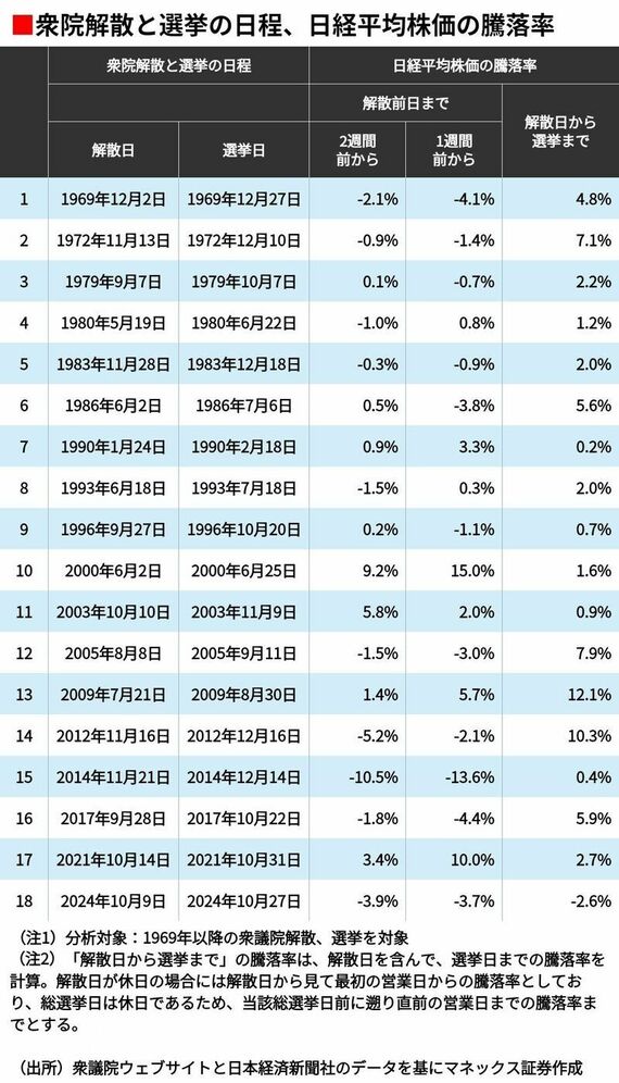 もっとも、過去を振り返ると、解散前日まで株価が上昇した後も、解散日から選挙日まで改めて株高が進んだケースは少なくありません。