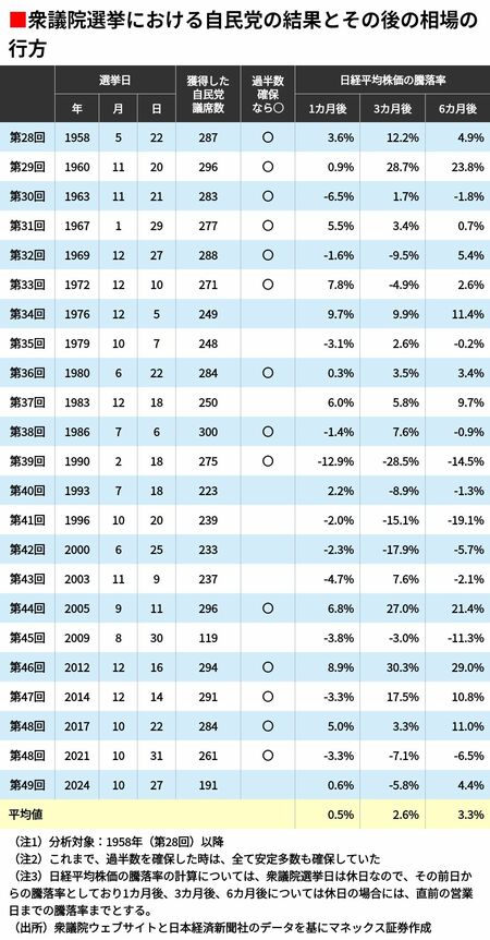 下表では、1955年に自民党が結成されて以降の衆議院選挙について、選挙後の株価動向を確認しました。