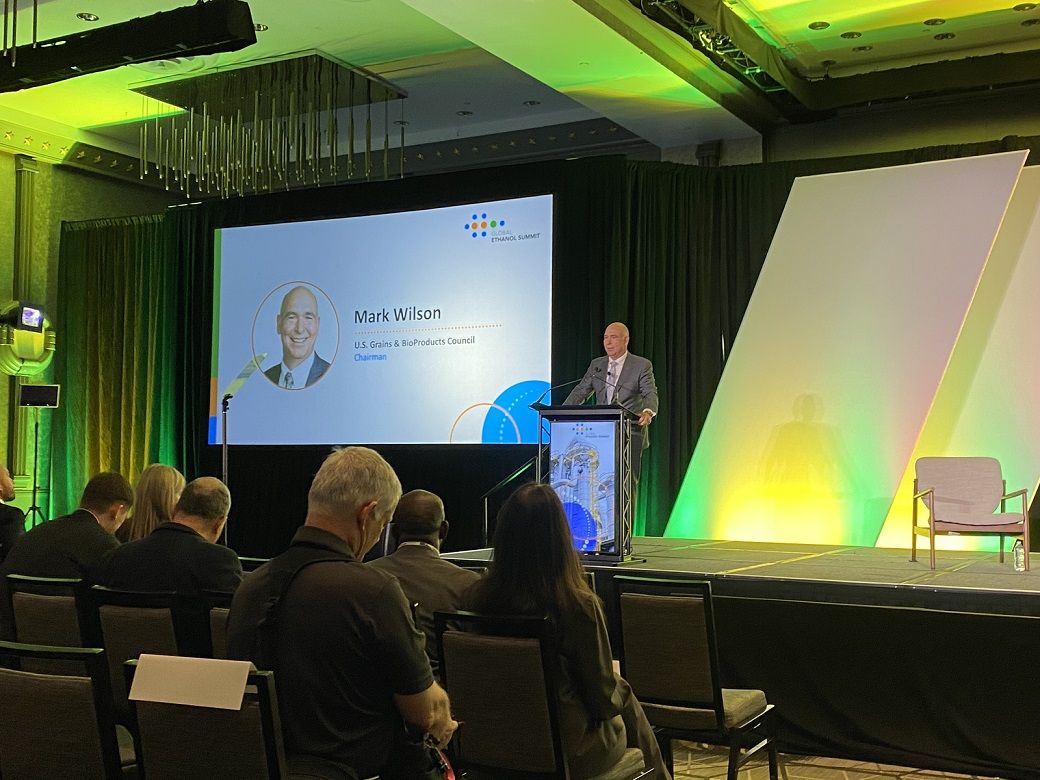 グローバル・エタノール・サミット2025でスピーチをするアメリカ穀物バイオプロダクツ協会(USGBC)のマーク・ウィルソン会長 (筆者撮影)
