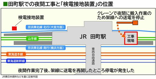 停電トラブルの当日、クレーンによる資材の搬入作業は午前3時20分ごろに完了し、始発電車に向けて架線への送電を再開するための手続きを開始した。手続きは「作業の終了が確認できたのち、検電接地装置を(開放状態に)切り替えて、その後に現地の責任者が停電作業の終了の報告を行う」(JR東日本)という手順で、装置は現場の停電作業の責任者が操作するという。