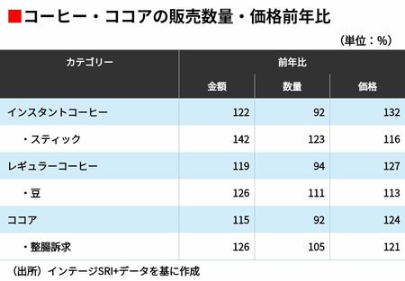 ただし、計量不要でお湯を注いでさっと準備できるスティックタイプのインスタントコーヒー、高品質を訴求する豆タイプのレギュラーコーヒー、整腸効果を訴求するココアは販売数量も前年を上回っており、高価格・高付加価値商品として需要が底堅いようだ。