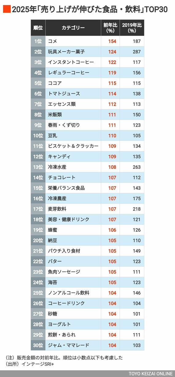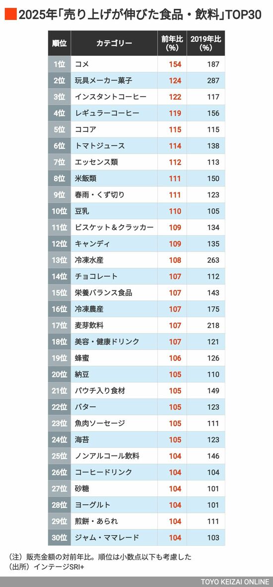 2位の玩具メーカー菓子や3位のカルシウム剤も、数量の伸びでランクインした。玩具メーカーが取り扱うおまけ付きの菓子である玩具メーカー菓子は、19年との比較では3倍近い287%まで伸びている。