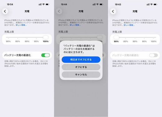 普段は80%に設定しておいて、長時間外出する場合だけ100%に設定すれば、日常生活ではバッテリーのダメージを抑制し、一日中外出して活動するような日だけ100%の電力を使うというようなこともできる。