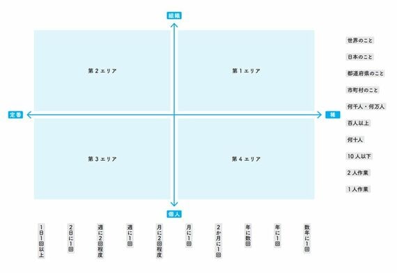 マップの1つ目の軸は、「その出来事や作業の規模」です。関わる人数について、10個の指標を置きます。そして、もう1つの軸は「その出来事や作業の頻度」です。頻度の評価もまた10個の指標を考えました。