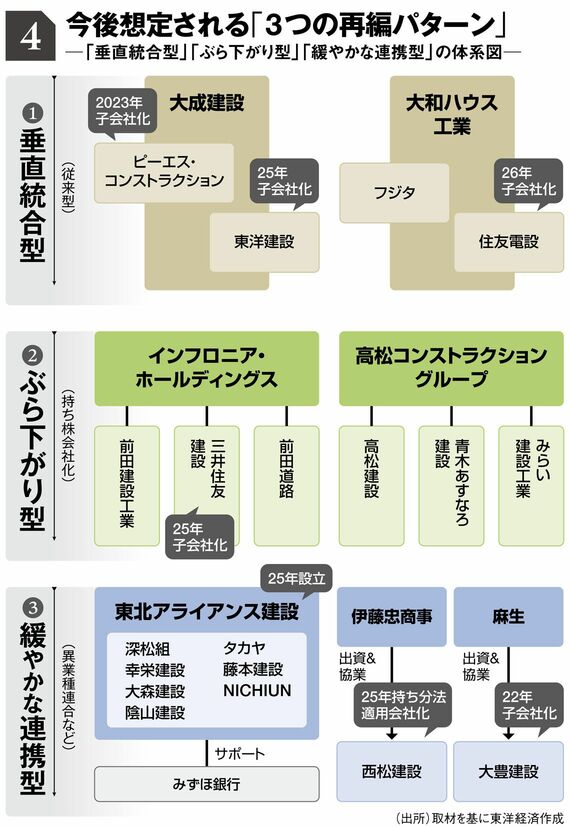 この先、考えられる再編の形は主に3つ。1つ目は「垂直統合型」だ。実例としては大成建設による東洋建設の買収、大和ハウス工業による住友電設の買収が挙げられる。特定分野の補完やグループの連携強化を企図した従来型の拡大戦略といえる。