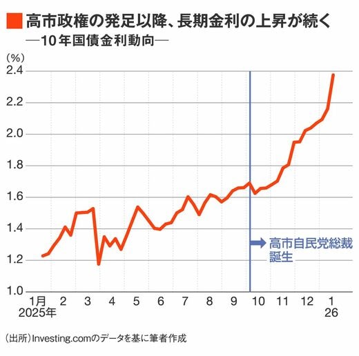 日本国債の金利が上昇している。2025年10月の高市政権発足以降、長期金利(10年国債金利)は上昇傾向にあった。それが26年1月19日の衆議院解散会見によって上昇の動きが一段と加速し、長期金利は一時2.37%と27年ぶりの水準となった。