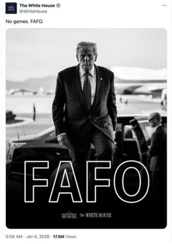 今年1月4日、米軍特殊部隊がベネズエラのニコラス・マドゥロ大統領を拘束した直後、ホワイトハウスが異例の短い声明を発表した。トランプ大統領の写真と共に添えられたのは「No Games. FAFO」というメッセージだ。日本のビジネスリーダーや政府関係者にとって、この略語は初耳だったかもしれないが、その意味を理解することが今や極めて重要だ。