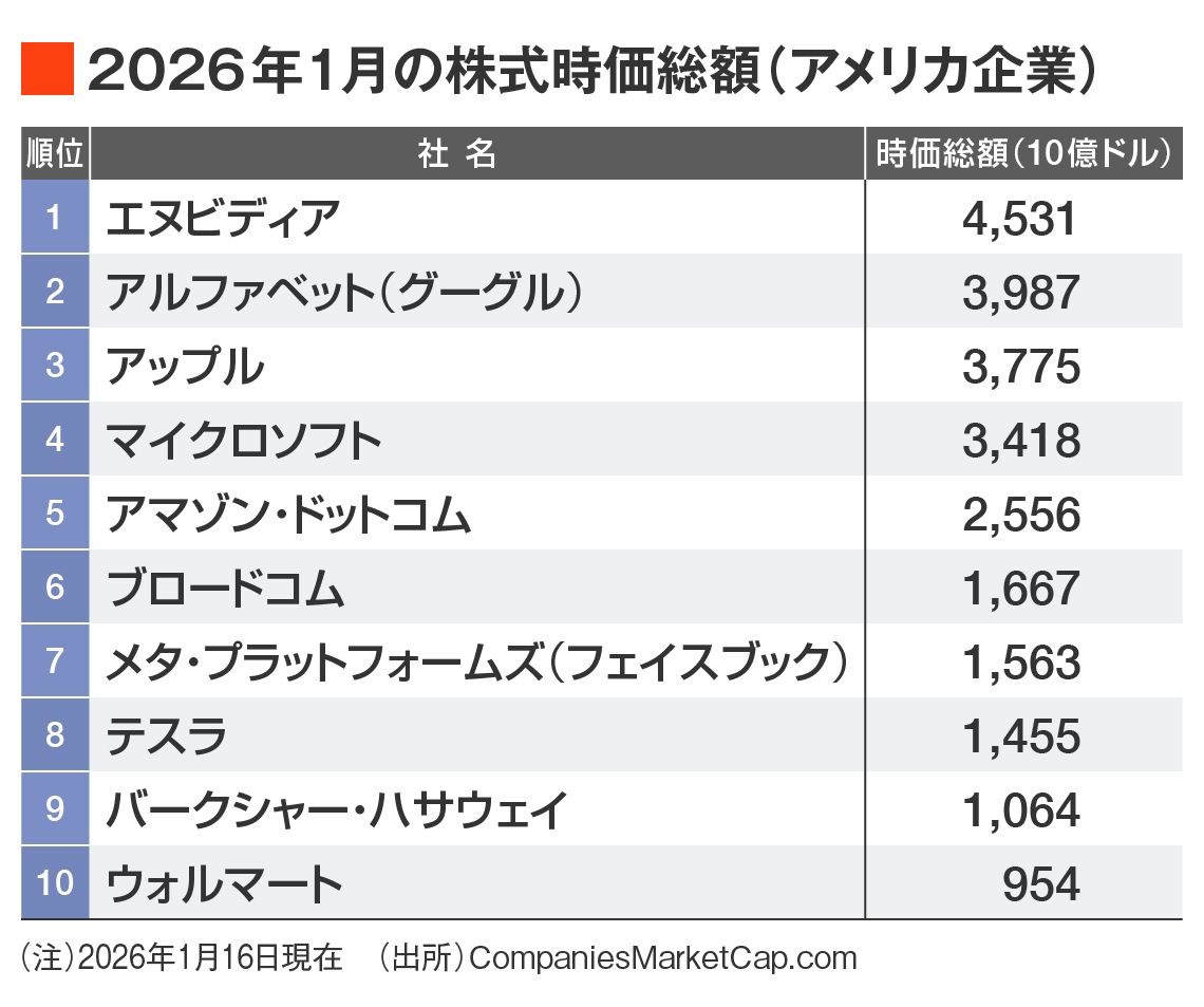 ここでつねに引き合いに出されるのが、2000年に崩壊したネットバブル(ドットコムバブル)だ。まずはネットバブルの絶頂期(2000年3月末)と、足元(2026年1月16日現在)のアメリカ株式時価総額トップ10を比較してみよう。