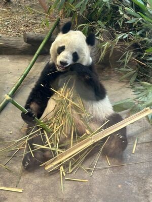 両足をひろげ、ただひたすら食にいそしむその姿は、とうてい野生動物のそれとは思えず、ユーモラスであり、擬人的である。かつて日本でみたパンダはひたすら寝ていたので、パンダの何がそんなに面白いのだろうかと思っていたが、ようやくパンダの魅力を理解することができた。
